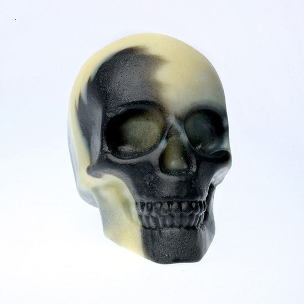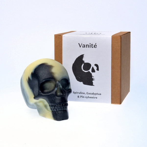 savon-artisanal-naturel-cosmetique-saponification-crane-skull-tete-mort-vanite-karite-coco-charbon-huiles-essentielles-eucalyptus-spiruline-amande-douce-blanc-noir